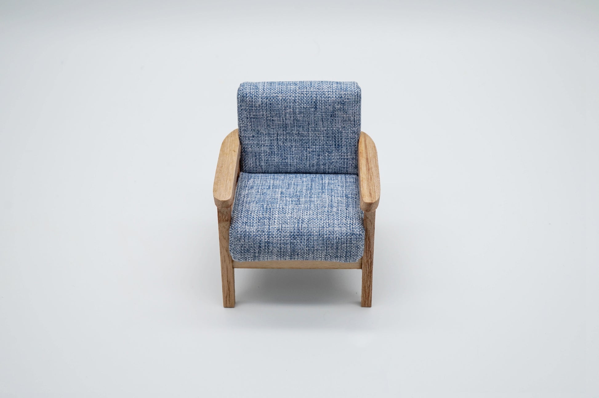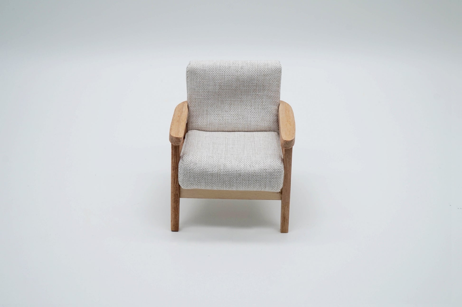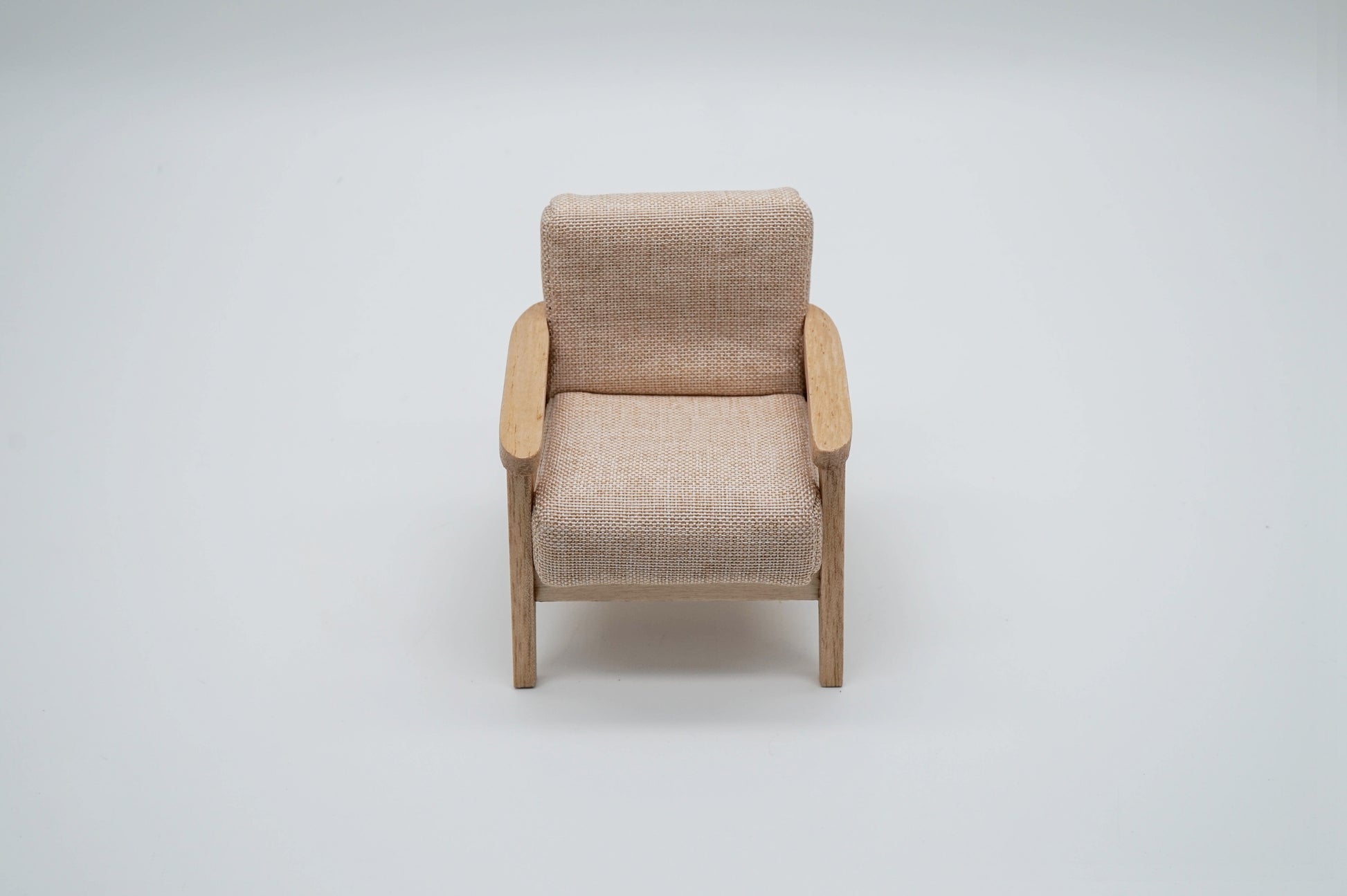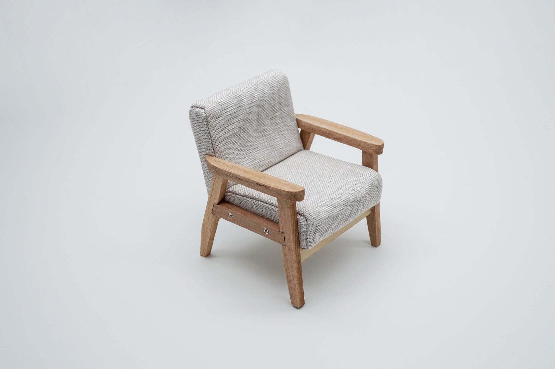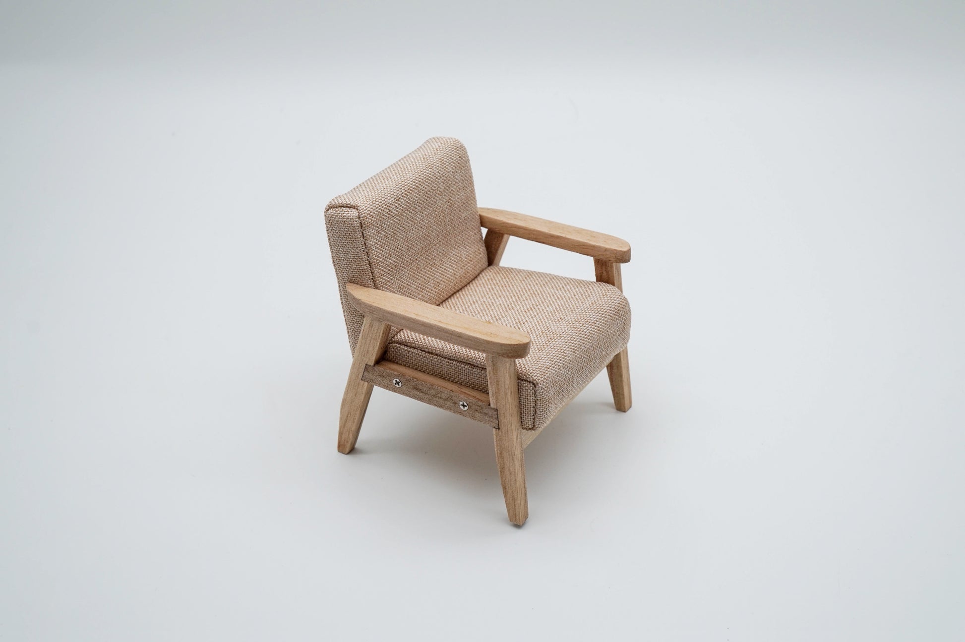 This miniature one-seater/two-seater sofa is crafted from wood and fabric. With its modern design, this sofa is a stylish addition to any miniature setting.