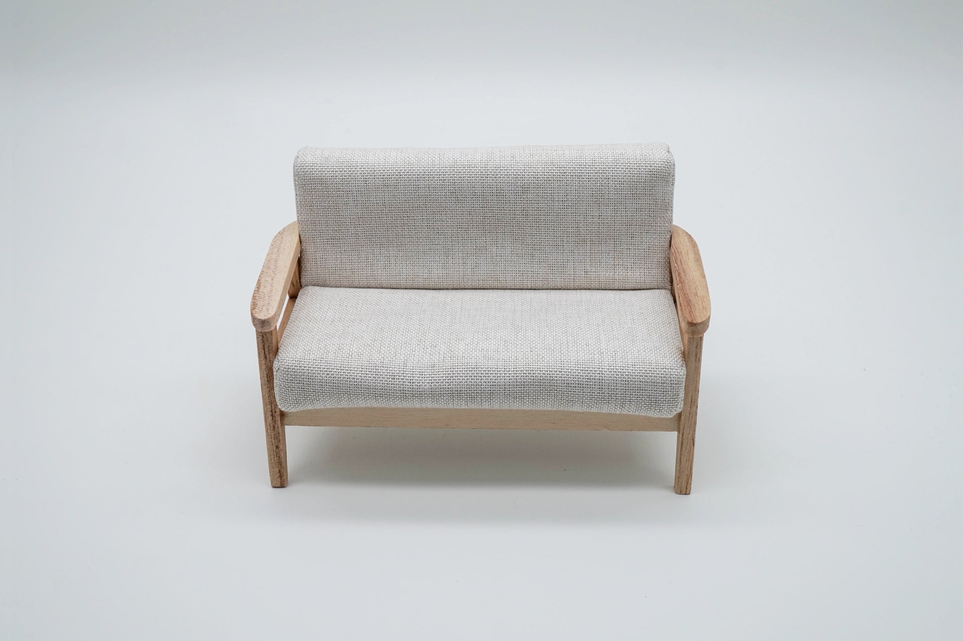This miniature one-seater/two-seater sofa is crafted from wood and fabric. With its modern design, this sofa is a stylish addition to any miniature setting.